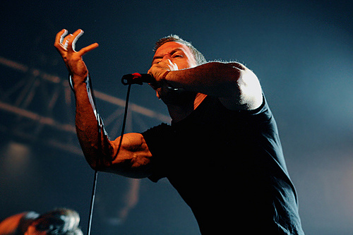 Par contre, ce qui suit est carrément moins drôle. La foule se compresse à nouveau au coucher du soleil, les fly cases sont postés debout sur le bord de la scène. Ça va faire mal… A peine le Dillinger Escape Plan entre sur scène, que je me prends un bulldozer de plein fouet, imprimant les motifs de la rambarde dans ma chair. Un Danois je crois. De sacrées bonnes machines qu’ils font ces Nordiques, surtout qu’elles connaissent les paroles du groupe par cœur… En tout cas sur les planches, ça dégomme ! N’ayant jamais écouté d’albums des Dillinger, je me retrouve soufflé par la puissance phénoménale du quintette, débordant d’une énergie incontrôlable et d’une technique florissante touchant à la fois aux sphères les plus intenses de la violence puis la seconde suivante à un break jazz glauque et écrasant… Le tout avec une précision et une musicalité impressionnante sublimée par les compositions barrées de Ben Weinman et de ses guitares convulsives. Le temps que je me rende compte de tout ça, étant toujours en lutte avec la bête danoise pour conserver mon bout de rambarde, deux morceaux se sont déjà écoulés, et quand je vois le bordel qui se déroule devant mes yeux, je comprends que le public doive répondre en contrepartie. Un batteur incroyable caressant ses peaux avec une vitesse hallucinante et une technique à couper le souffle, des cordistes hystériques au son glacial et chaotique et Greg Puciato, un monstre, une créature fascinante au charisme n’ayant d’égal que ses capacités vocales, ne pouvant à peine tenir en place, grimpant sur les enceintes, s’agrippant à la structure, entrant en collision avec ses musiciens, sautant d’un fly case à l’autre, hurlant sauvagement et chantonnant une mesure plus tard… « Christine Boutin… Christine Boutin, hahahahaha… What a bitch ! »… Tu m’étonnes que Patton ait été bluffé… Le concert terminé, je tends le médiator qui m’a été offert à la nana en extase à mes côtés et regrette de ne pas avoir pu apprécier pleinement le concert… Saloperie de blond musclé…